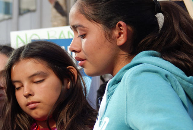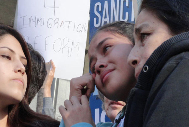 “We’re better than Trump, we deserve better than this, we are not leaving,” said an emotional Jocelyn Avelica, the 19-year-old daughter of Romulo Avelica-Gonzalez, who was arrested last week by ICE officials wearing jackets emblazoned with “police” after he dropped his 12-year-old daughter off at school. His 13-year-old daughter, Fatima, watched crying from a car and recorded the arrest. The video has received more than 4 million views.